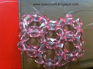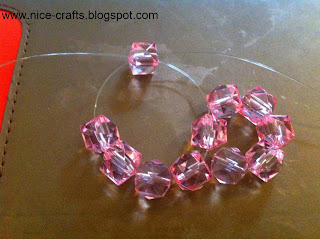 5-أدخلي في أحد الخيطين 3 حبات خرز و قاطعيهما في الحبة الثالثة و قومي بشد الخيط جيد إذا لم يقف هذا الجزء فإدفعيه بيدك نحو الأعلى  .