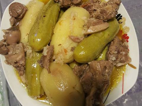 بطنجرة بصف عظام وفوقا بصف الكوسا وبغمر بصلصة عباره عن مي وملح وزيت ومكعب ماجي وبتقلن
