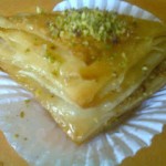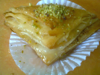 نضع كل 8 ورقات على بعضهم ونقوم بتقطيعها مربعات متساويه بسكين حاااد جدا وخلى بالك من ايدك بحزر شديد ومسطره خشب علشان تكون القطع متساويه وفى كل مربع نقوم بوضع فسدق حلبى مطحون ونقوم بقفل المربعات على شكل مثلث ونضع البقلاوه فى صينيه مدهونه بالسمن وندهن البقلاوه بفرشاه وخليكى كريمه فى وضع السمنه عليها