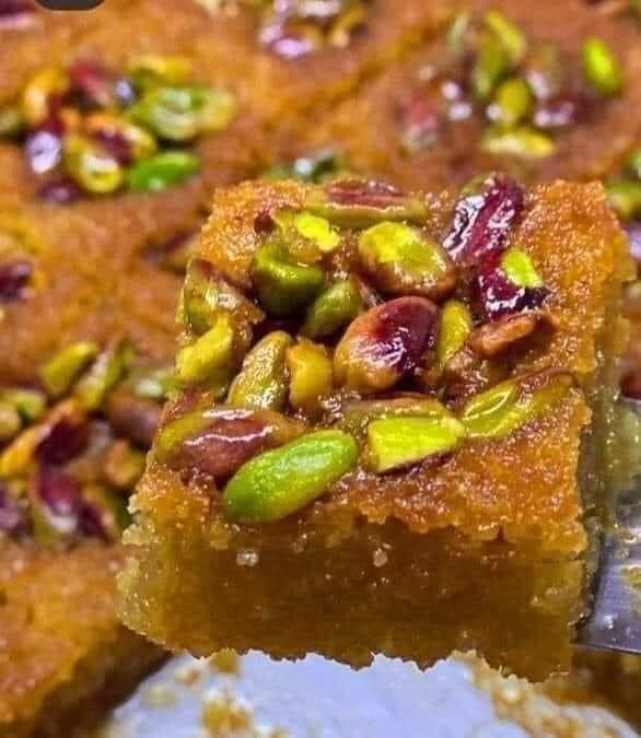 نقوم بصب القطر الساخن فوق الهريسة ببطء ثم نترك الهريسة لترتاح لمدة 4 ساعات