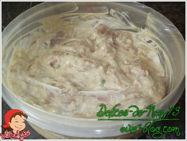 ثم تمزج كل العناصر حتى تتغلف كل قطع الدجاج بالزبادي و البهارات