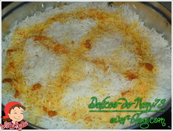 ثم نغطي خليط الدجاج بباقي كمية الأرز و نسقيها بما تبقى من مزيج الحليب و الزعفران