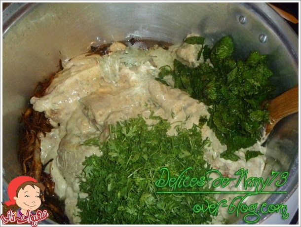 بعد ذلك نضيف خليط الدجاج و الزبادي + الكزبرة و النعناع