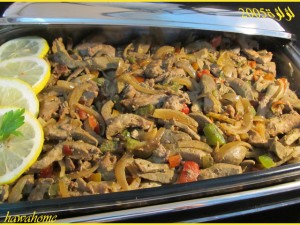 ثم نقلب الكبدة مع البصل والفلفل ونضع التوابل