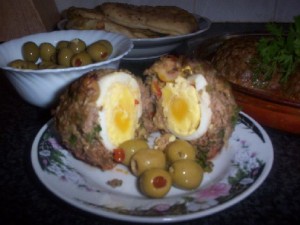 نحشي الكفتة بالبيض كما هو مبين بالصورة بالبيض والزيتون ونشكلها على شكل كرات .