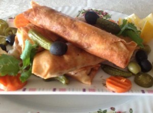افتحي ورقة من العجينة وغطي الباقي حطيها على شكل مثلث الزاوية لفوق وحطي حشوة بعد الزاوية شوي وحطي حبة من الجبن وسكري الجانبين بحيث تلاقي الزاويتين إلى على الجنب مثل الظرف وابدي لفي زي الأسطوانة حتى تصلي لآخر سكري ببياض البيض وكملي الباقي بنفس الطريقة إلى أن تخلص الحشوة