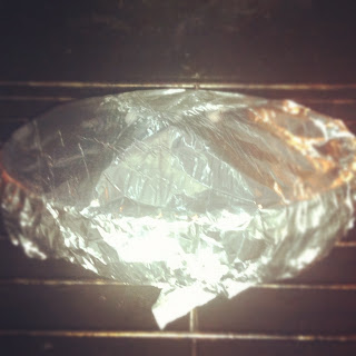 تدخل الفرن على درجة 180، نقفلها بالقصدير وتترك حتي تستوي وتصبح ذهبية لمدة 45 دقيقة ثم فتحة