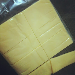 ونقطع الجبن شدار إلى مربعات و نضع بين الحلقات البطاطس ونتاكد من دخولها بين الحلقات