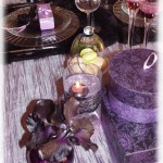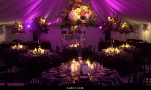 الطاولات بشكلها الدائري مغطاة بالمفارش ذات االلون البنفسجي
